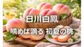| 日川白鳳 | 6月中旬〜 7月上旬 | 上品な甘さと爽やかな香り | 果汁たっぷりでなめらか | 山梨県 | 白鳳系の早生種 夏のはじまりを告げる“桃の先駆け” |